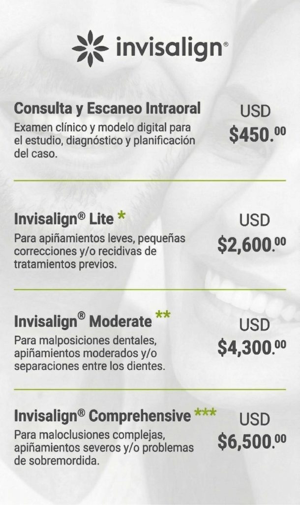 Por su esencia y naturaleza, Invisalign® es sin duda un sistema de alto valor, y según la complejidad del caso, duración del proceso y número de alineadores requeridos; sus tratamientos se categorizan en 3 tipos: Lite, Moderate y Comprehensive.